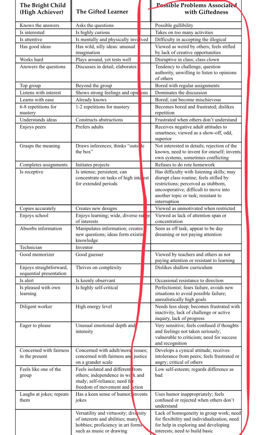 Here is a handy-dandy chart of the things that make us gifted in contrast to our nuerotypical counterparts, but with every amazing quality comes a possible downside. No one gifted person has all of these qualities, nor does any one person have every single one of these problems, however, we have to acknowledge that too much of a good thing can certainly be a bad thing.