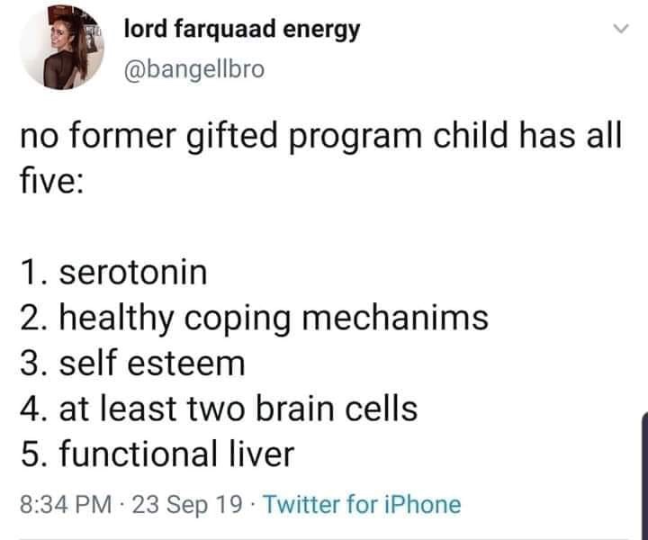 So, a while back, I wrote a post called Kids turn into adults. I elaborated on that thought on my facebook page via a status update and a meme I found yesterday, and it gained some traction. Several of my friends, who are also recovering gifted children, commented on the post. And, not surprisingly, a few parents of today’s gifted children also commented. I promised them I’d gather my thoughts and post them in a coherent way, so here it goes: